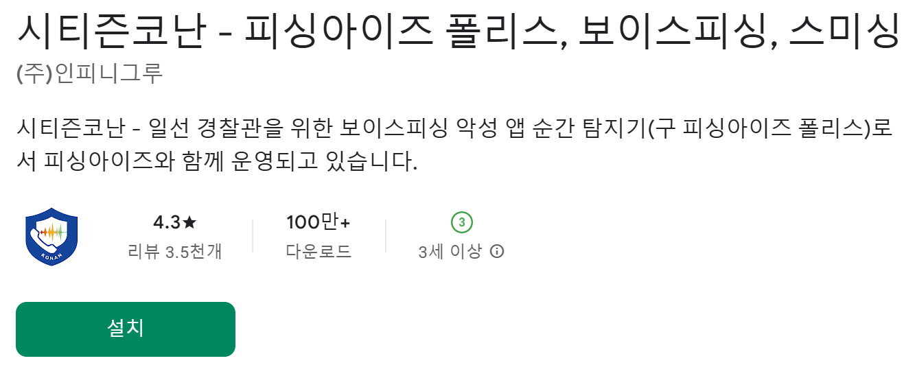 시티즌 코난은 경찰청과 IT 기업 인피니그루가 협력하여 개발한 공식 보안 앱입니다. 이 앱은 보이스피싱이나 스미싱과 같은 온라인 금융 사기를 막기 위해 제작되었습니다. 지금 즉시 다운로드하세요. 스마트폰에 숨겨진 유해 프로그램을 찾아내고 삭제해, 사용자가 인지하지 못하는 사이에 발생할 수 있는 피해를 방지합니다.